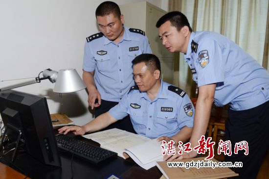 邓锦荣与他的团队民警许建国、吴德敏在研究案情。