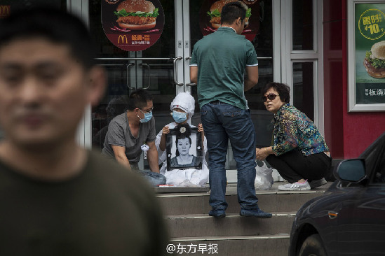 今天是“招远血案”死者头七。上午10点10分,死者的丈夫、儿子等多名亲属来到事发麦当劳门前祭奠,整个过程持续了五分钟。(早报记者 刘兴旺 文 寇聪 图)