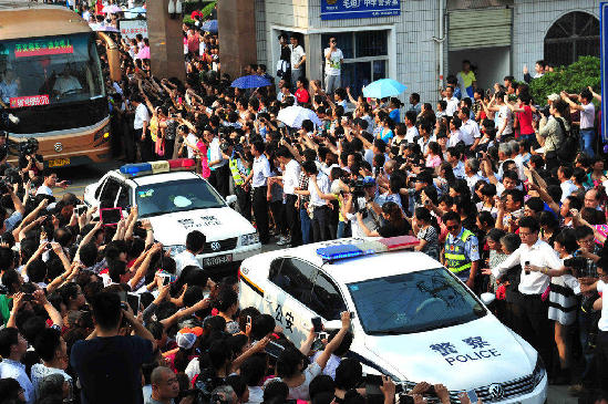 2014年6月5日早晨8点08分,安徽六安,从毛坦厂中学缓缓驶出32辆大巴,7000多名外地考生及复读生将乘车回户籍所在地参加高考,相比去年的70辆大巴车送考,今年已减少到32辆。满载考生的大巴车缓缓开出,毛坦厂镇万余民众夹道欢送。