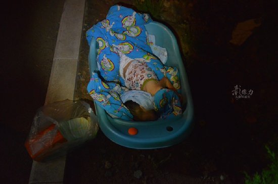 6月12日凌晨,在距离弃婴岛约200米处,盆子里放着一个三、四岁左右的孩子,被弃放在路旁。齐鲁网记者 于鹏 满倩