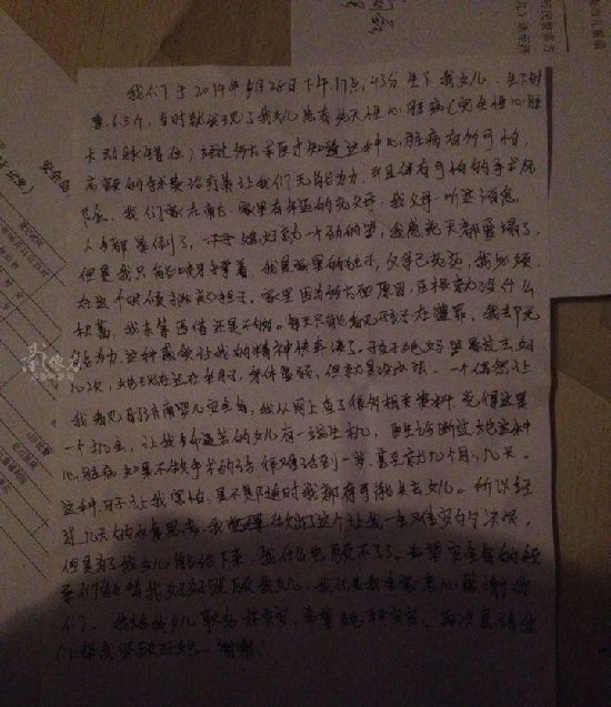 一位弃婴父亲写的字条,他说,孩子妈妈还在坐月子,女儿只有十几天天,患有先天性心脏病。父亲面对镜头,双眼红肿,他告诉记者,“他无力抚养女儿,给她取名叫林安安,希望她平平安安。”(齐鲁网记者 于鹏 满倩)