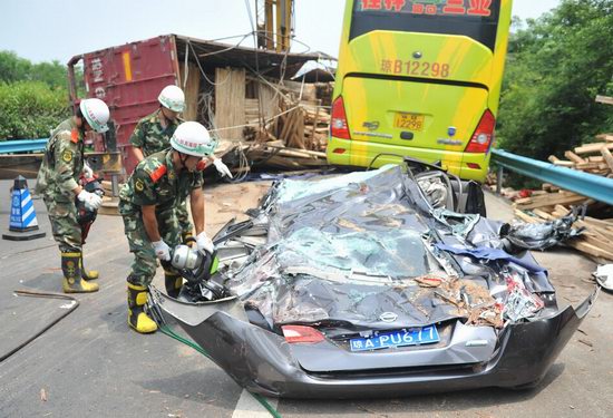 6月14日,海南琼海,救援人员正在撬开压扁的小轿车救人。当天上午九时许,海南东线高速公路海口往三亚方向59公里处发生一起重大车祸,一辆载满木条的大货车侧翻埋压住一辆小轿车后,又撞上大巴车,事故导致小轿车上的4人当场死亡,2人受伤,所幸大巴车上的人员并无大碍。图为事故救援现场。