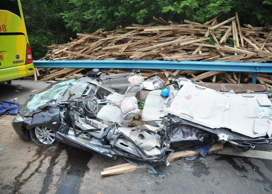 海南一轿车被大货车压扁致4死2伤