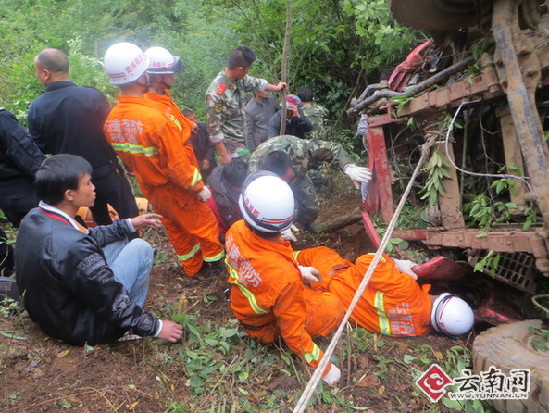 当天下午14时,云南昭通消防大队接警,镇雄县场坝镇安尔村烈士陵园路段一货车侧翻下悬崖,现场1人被困,请求出警救援。