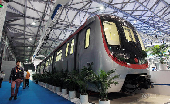 6月17日,参观者从“无人驾驶”地铁列车旁经过。当日,中国北车长客股份有限公司制造的国内首列“无人驾驶”地铁列车在上海2014中国国际轨道交通展亮相。新华社记者裴鑫摄