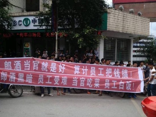 2014年6月16日早8时,郎酒集团位于四川古蔺二郎镇生产总部近千名员工罢工。工人拉着横幅声讨郎酒集团与工人的不公平待遇,据当事人介绍,罢工一直持续到当晚10时许。