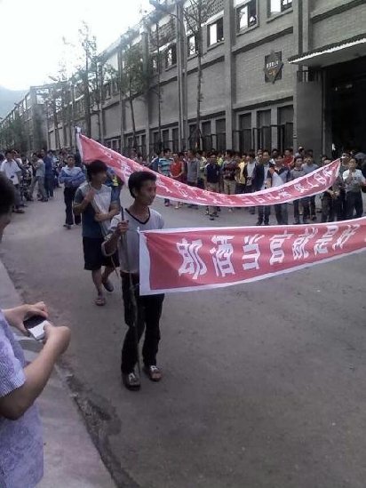 罢工源头是涨工资问题。据郎酒厂工人給记者反映,郎酒集团今年5月下发涨提薪方案前,酿造车间工人每月工资为1700元—1800元基本工资,加加班费500元共计2300—2400元。图为参加罢工的郎酒员工持示威标语上街。