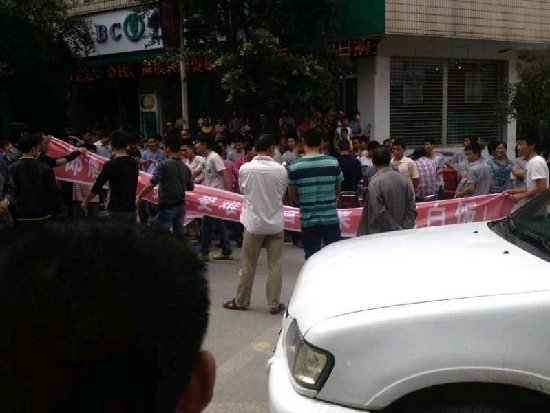 该员工称,此次罢工诉求是恢复原来超产奖的百分率,还有人员配置不够产生的加班费得发。超产奖的百分率有所变动,工人认为变相降低了工资。图为参加罢工的郎酒员工持示威标语上街。