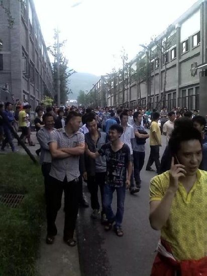 另郎酒厂二线工人反映,本月12日左右,酿造工人和包装车间工人工资按时发了,但后勤、保卫,办公室员工工资至今未下发。据悉,16日,罢工人员占二郎镇郎酒厂一线工人80%左右。其中,两河口分部基本上全停了,老厂尚有少部分工人在生产。图为参加罢工的郎酒员工。