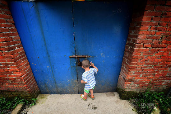 “食品监督员”告诉记者,他们是为了保护动物,反对屠宰的丢狗丢猫人士。其中一位中年女子说:“这里的屠宰都是非法行为,他们没有检疫合格证。“当他们向门内的主人索要证件时,并不被理睬。图为屠宰场大门紧闭,一名小朋友在门口张望。