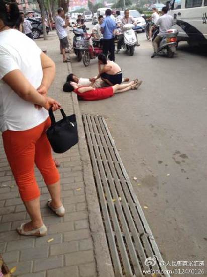 这名网友连发3张现场图片,图上可见,一上身穿浅色T恤的年长女子躺在车道上,头枕人行道沿,而身旁一姑娘蹲在地上,拉着她的手。而她们旁边一名身穿红色连衣裙的女子也头枕人行道沿躺在车道上。