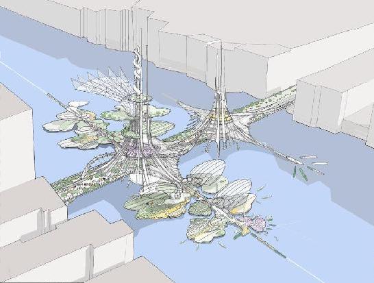 Chetwoods采纳了寓意“双凤”的神话风格,采用高低双塔组合式结构,较高的塔为“凤”,稍矮塔则为“凰”。建成高度为3280英尺(约合1千米),占地面积近70000平方米,整个建筑将坐落在一个45公顷的湖心岛上。