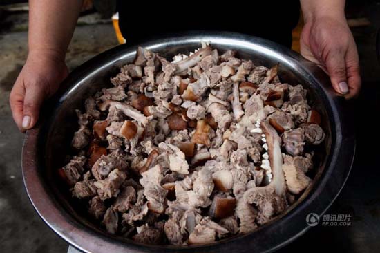 6月21日,广西玉林,店主将剁碎的狗肉装盆以备晚上客流高峰。刘畅 摄