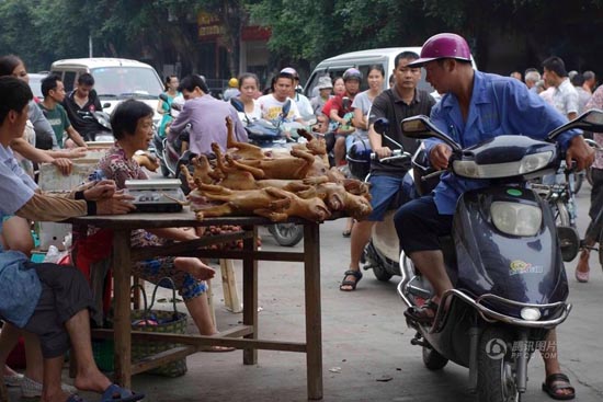 21日清晨,玉林垌口市场就已挤得水泄不通,人群中不乏爱狗人士、记者、网民看客以及公安等部门人员。在出售狗肉的档口,商户忙着砍狗卖肉,一名商户告诉记者,今年的热闹程度不亚于去年,且销量比去年好。6月21日,广西玉林,玉林大市场路边的狗肉摊。