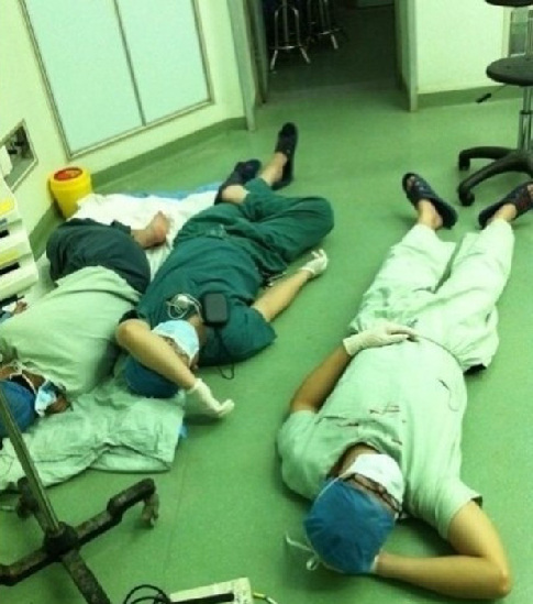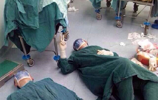 图为连续手术后,陈靖和陈松两人累瘫在手术台边,陈松给出了胜利的手势。