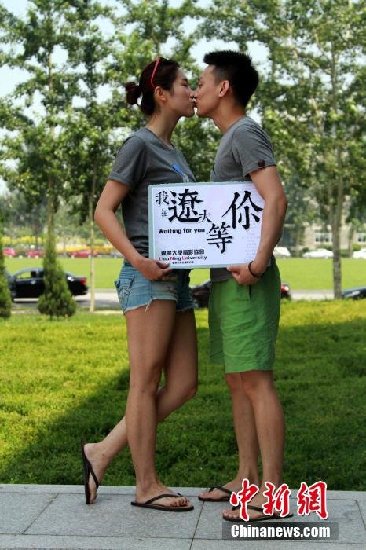 6月23日,情侣拿着“我在辽大等你!”的牌子在拍照。中新社发 于海洋 摄