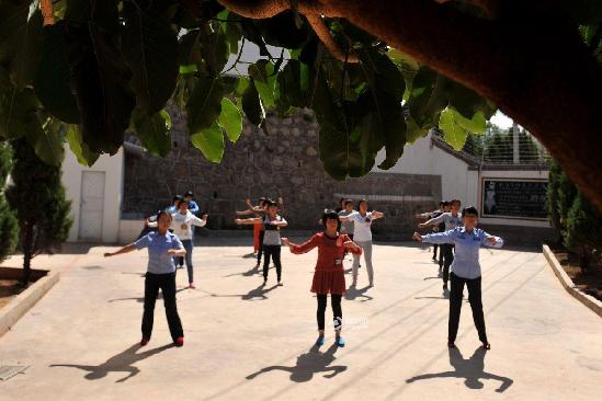 6月23日,阿秀(中)在大理戒毒所内和其他学员及监管民警一起跳健身操。新华社记者 蔺以光 摄