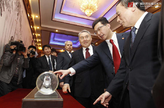 据中国工程院院士王梦恕介绍,中国正在和二三十个国家都在谈高铁的合作。这些跨国高铁的建设由中方出资金和技术,用修建高铁来置换当地资源,比如中亚的天然气。2011年,中国宣布承建哈萨克斯坦350KM/H高铁。图为2011年2月22日,哈萨克斯坦总统纳扎尔巴耶夫与中国国务院副总理王岐山在北京钓鱼台国宾馆,共同出席中国高速铁路推介会。盛佳鹏 摄