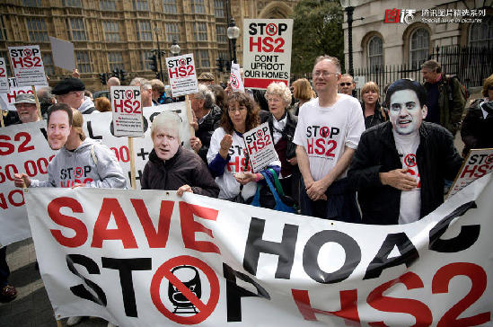 中国极力争取的英国“HS2”高铁线,一期工程投资额约为170亿英镑,计划2026年建成。然而,这条英国史上造价最高的铁路线修建计划虽受到商界人士和工会的支持,但遭到沿线居民团体、地方议会以及环保组织的抗议。图为2014年4月28日,英国伦敦,部分民众在议会大楼外集会要求停止建设高铁项目。英国高铁项目HS2自从2010年公布计划以来一直争议不断,直至今日尚未开工。