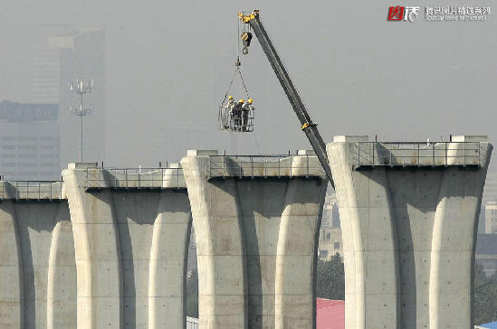 高铁技术和规模的增长,离不开巨额的投资。2009年,全国铁路完成固定资产投资猛增至7000亿,近几年增速有所放缓但也一直维持在较高位。今年4月,铁路固定资产投资计划由年初定的6300亿元调高到8000亿元以上,铁总同时强调:不怕超,不怕冒,确保完成全年投资计划。图为2009年10月20日,江苏省南京市,中铁集团的建筑工人乘坐吊车前往沪宁城际高铁的高架桥墩进行施工。安心 摄