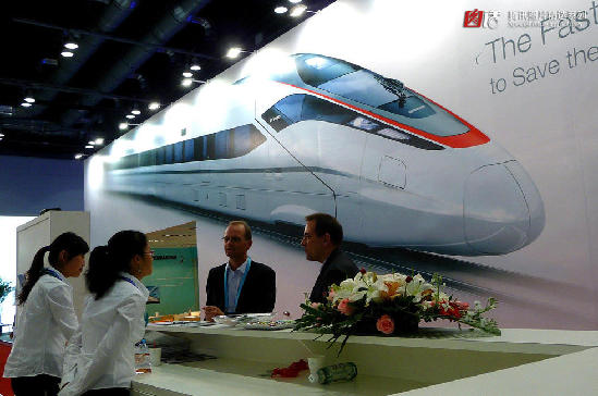 根据规划,到2020年,中国高铁将达1.6万公里以上,覆盖中国90%以上人口地区。飞速的发展也意味着在五六年后,高铁建设需求将骤减,如今每年数千亿元的巨大市场需求将无处安放,高铁产业也将随之面临困局。当内需已经不能满足中国高铁企业胃口时,让高铁“走出去”成为消化发展高峰期过后剩余能力的有力途径之一。图为2010年12月7日,第七届世界高速铁路大会展览会在北京国家会议中心举行。中新社发 玉龙 摄