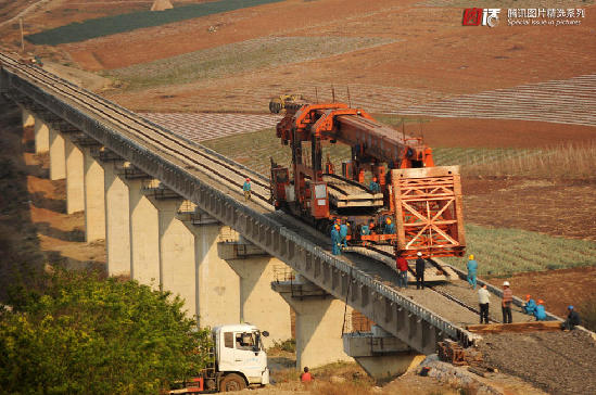 在这种背景下,中国更是规划了高铁“走出去”的三个战略方向,可谓壮志雄心:通过俄罗斯进入欧洲的欧亚高铁;从乌鲁木齐出发,经过中亚最终到达德国的中亚线;还有从昆明出发,连接东南亚国家,一直抵到新加坡的泛亚铁路网。图为2012年3月10日,中国中铁公司一局的施工人员在泛亚铁路东线玉溪至蒙自段高家庄二号大桥铺轨。新华社记者 李晓果 摄
