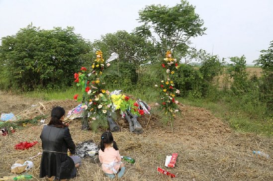 妻子刘文丽带着女儿涵涵在徐园的坟前给他送行。
