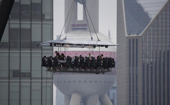6月27日,上海,位于陆家嘴的空中餐厅营业,食客们冒雨登上餐厅。当日,疯狂的“空中餐厅”亮相浦东陆家嘴某五星级酒店,酒店将在3天时间里推出14场“空中餐厅”服务,共有308个席位,享受这样一次餐饮服务的代价从1888元到8888元不等。