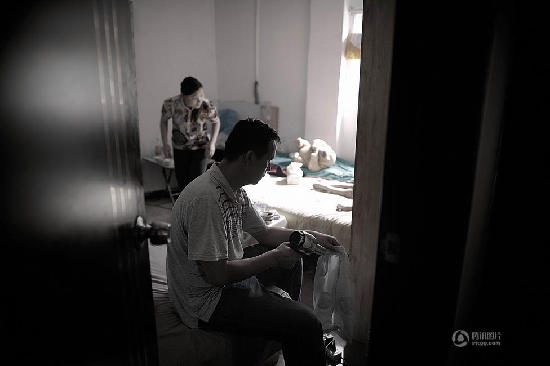 狗狗大小便失禁,家中带来的衣物不够用,洗干净后,邱培亮就用电吹风不停地吹干。