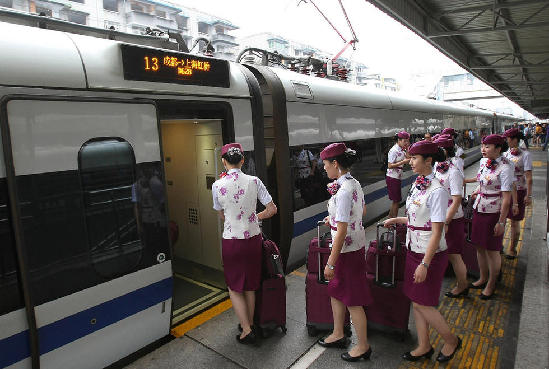 列车上的动姐都是专门招聘的,接受过军训、礼仪培训和红十字救生培训。每个动姐身高都超过1米66,大专以上学历,会英汉双语交流。每个能够上岗的动姐都是文化高、形象好、气质佳。这些服务员将为16个车厢的旅客提供优质服务,其中2名专门为10号车厢的高级卧铺服务。
