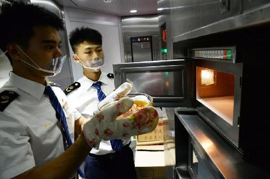 “全国首次采用全微波烹饪的模式。”成都客运段旅服车间主任杨禾说,列车上供应的食物都在站下便烹熟或制成半成品,上车后只需使用微波炉加热便可食用,“打造无油烟厨房,更环保。”