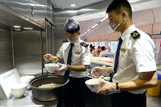 餐车服务员在“川味餐吧”里为旅客准备具有川味特色的午餐。