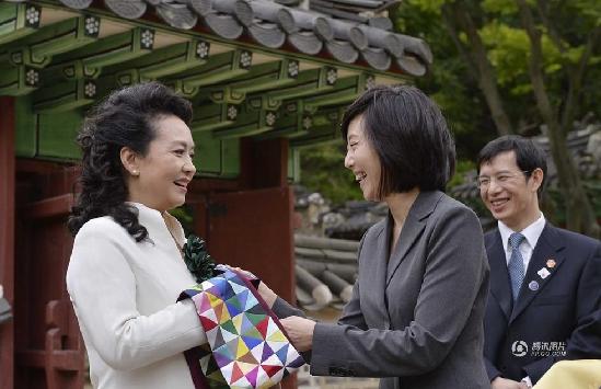7月3日下午,彭丽媛与韩国代理“第一夫人”赵允旋一起游览昌德宫。