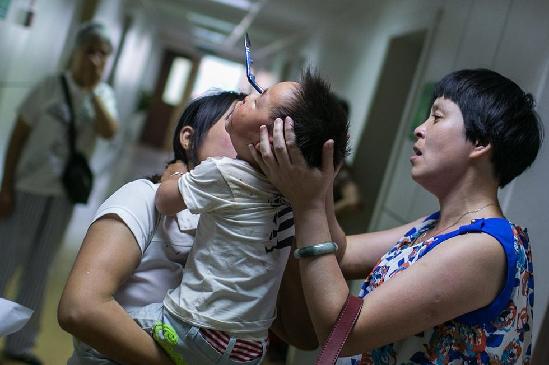 7月3日,一名三岁小男孩眼睛里插进一把剪刀被送往杭州市第一人民医院抢救。男孩妈妈介绍,儿子叫小泽,老家河南,一家人都在慈溪一家服装厂打工,一起帮忙托着小泽额头的,是服装厂的老板娘。