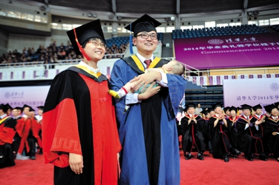 清华大学的博士研究生陈程(左)和丈夫仲晓波(右)怀抱着三个月大的女儿参加毕业典礼。