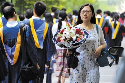 一位女士手捧鲜花参加昨日清华大学研究生毕业典礼,准备送给即将毕业的同学。