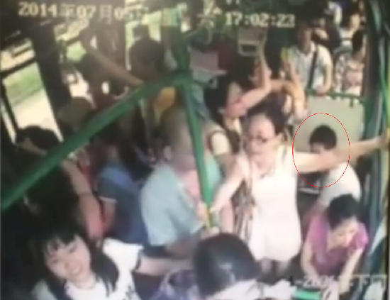 杭州警方在视频侦查中发现,7月5日16时09分,一名随身携带深色双肩包的男子,从7路车灵隐站上车后,经过车辆过道,到达后门照顾专座,将此深色双肩包藏匿于座位下;17时03分06秒,该男子起身,从包中取出并倾倒可燃物;3秒钟后,该男子用打火机点燃可燃物,致车厢内起火燃烧。图为公交车内监控视频,男子坐于左方座位。