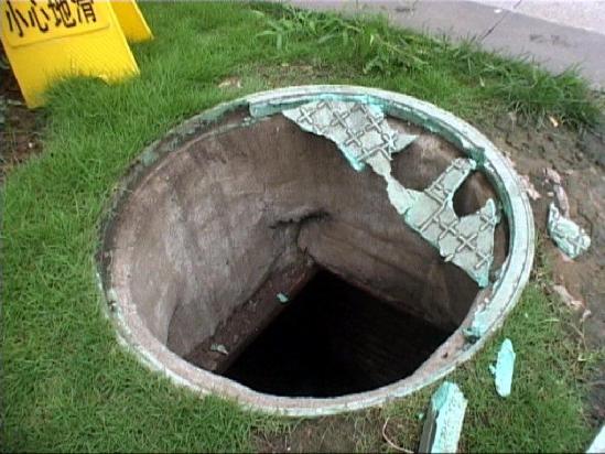 2014年07月06日,江苏省南京市,张着大嘴的窨井约有3米深,上面的的窨井盖却薄如“纸片”,最薄处只有0.7厘米。