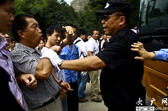 目前已经确定蜀山区有三处传销大巴车停靠点。其中,赖少其艺术馆门口为重要的一个停靠点。当天,合肥市蜀山区公安分局、市场监管局、城市管理局、区运管所、交警等十多个部门部门80余名执法人员,对赖少其艺术馆、省博物馆等地传销大巴车进行整治。图为执法现场。