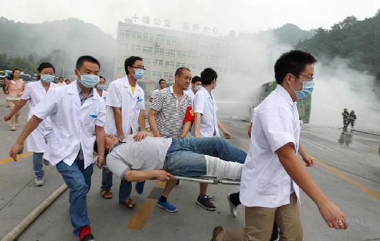 7月10日,湖北十堰举行公交车突发火灾事故应急演练。图为演练中将受伤乘客扶上担架急救。罗伟 摄