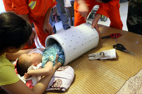 2014年7月12日17时04分,宿州市埇桥区鸿儒世家小区19栋403室,一名约3-4岁的男性儿童玩耍时,不小心掉进自家放在卫生间里洗衣机的甩干桶里,怎么也出不来,情况紧急。接警后,墉桥消防中队立即出动1辆抢险救援车6名官兵赶赴现场实施救援。图为消防员试图用手将小孩拉扯出甩干桶。