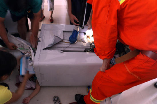 图为消防员将洗衣机横放在地面上,孩子的母亲守在一旁。