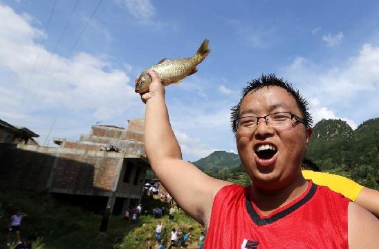 7月12日,在广西融水县红水乡良双村,一名村民扬起一条活鱼准备抛撒让人们抢抓。