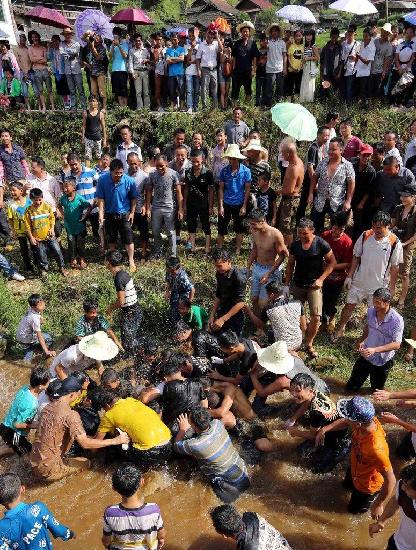7月12日,在广西融水县红水乡良双村,村民在闹鱼活动中抢抓已潜入水中的鱼。