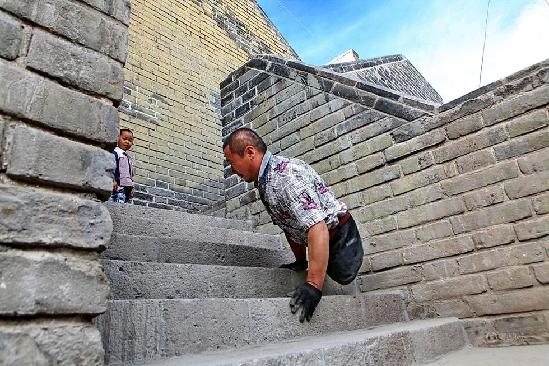 7月10日,王晓兵带着儿子爬张家口大境门长城。新华社记者 杨世尧 摄