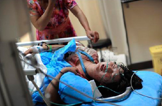 目击者邬先生说,“女的一直就抱着那个细伢子。”事故发生后不久,救护车就赶到了现场,医务人员将担架抬到了曾玲母子身边,但曾玲就抱着孩子,不肯上车,救护车至少等了10分钟。曾玲被送医后因情绪激动,被安置在抢救室内吸氧。记者来到医院时,曾玲躺在病床上,死死抱着小乐的遗体,医务人员多次劝解,她都拒绝松手。直到下午2点15分左右,多名医务人员与家属才强行将小乐遗体从她怀里分离出来。图为曾玲仍紧紧抱着已经死去的小乐。