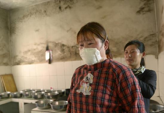 该准备午餐了,食堂阿姨在做饭菜之前穿戴衣服,身后就是被火烟熏黑的墙面。
