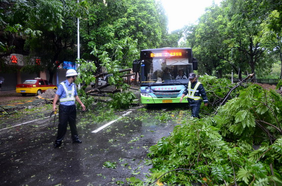 在台风登陆前,7月18日18时许,根据陈向大队长的工作要求,大队勤务一中队、勤务二中队、机动中队对赤坎辖区各路段开展巡查。巡查中发现,赤坎中华路保健院附近路段树木倒地挡路,李志翔副大队长立即和政秘股李枚股长,协管员李森等人用钢刀把倒地的树木砍断,搬移至路边;巡至海北路赤坎法院路段时,路边树木倒地把非机动车道给堵死,挡住电动车通行,李志翔副大队长、梁航中队长以及民警协管员立即下车进行清除;巡至人民大道北派丽商务酒店附近路段时,一张巨大的广告布被吹到横跨马路,对过往车辆造成严重影响,赤坎交警立即用刀具砍断移至路边,恢复交通;海滨大道海洋世界两边路段水浸,四航局至会展中心道路约400多米中间护栏被吹倒,沙湾派出所路口至嘉庆苑小区约200多米道路中间护栏被吹倒。