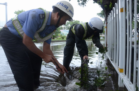 吴小明支队长带领广大民警、协管员冒雨奋战在路面。