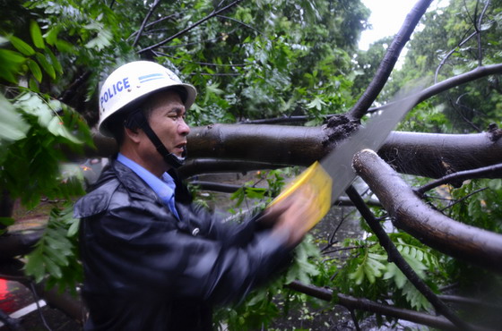 李志翔副大队长奋力清除倒地挡路的树木。